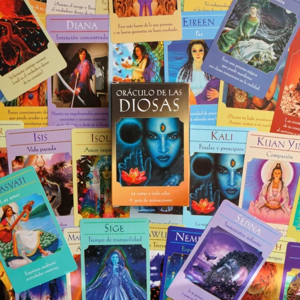 Las diosas son seres angelicales, poderosos y llenos de amor que quieren ayudarte en todos los aspectos de tu vida. En estas 44 cartas aprenderas quienes son las diferentes diosas de distintos credos y religiones, y como pueden mejorar tu vida, salud, relaciones, finanzas, carrera y camino espiritual. Los maravillosos diseños de cada carta muestran a Kuan Yin, Isis, Lakshmi, Brigida y Atenea, asi como a diosas de las tradiciones celtica, maya, egipcia, griega o budista, entre otras. La guia que las acompaña te ayuda a obtener lecturas precisas para ti mismo, tus seres queridos y tus clientes. Seas un principiante o experimentado profesional, encontraras que trabajar con las diosas aporta la magia Divina a tu vida.